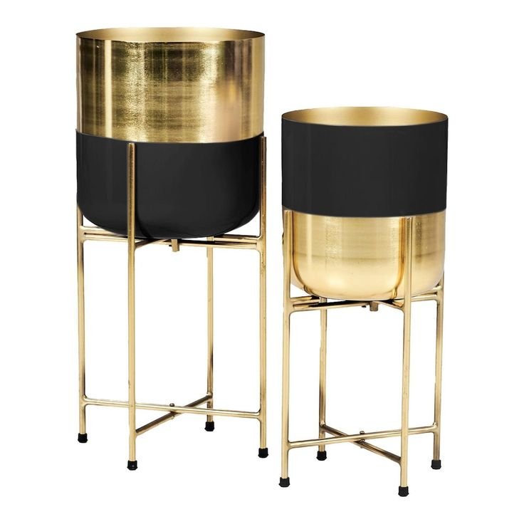 A chic duo of planters featuring a bold black and brushed gold finish, elevated on sleek gold stands to add height, contrast, and modern sophistication to your indoor décor.