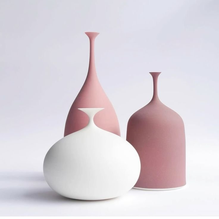 A graceful trio of vases in soft matte pink and white tones, featuring slender necks and smooth curves to bring a refined, modern elegance to any décor setting.