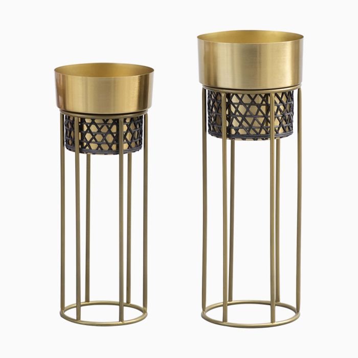 A sophisticated set of gold planters featuring a sleek metallic bowl paired with a decorative lattice accent, elevated on slim stands to bring height, texture, and modern elegance to your décor.