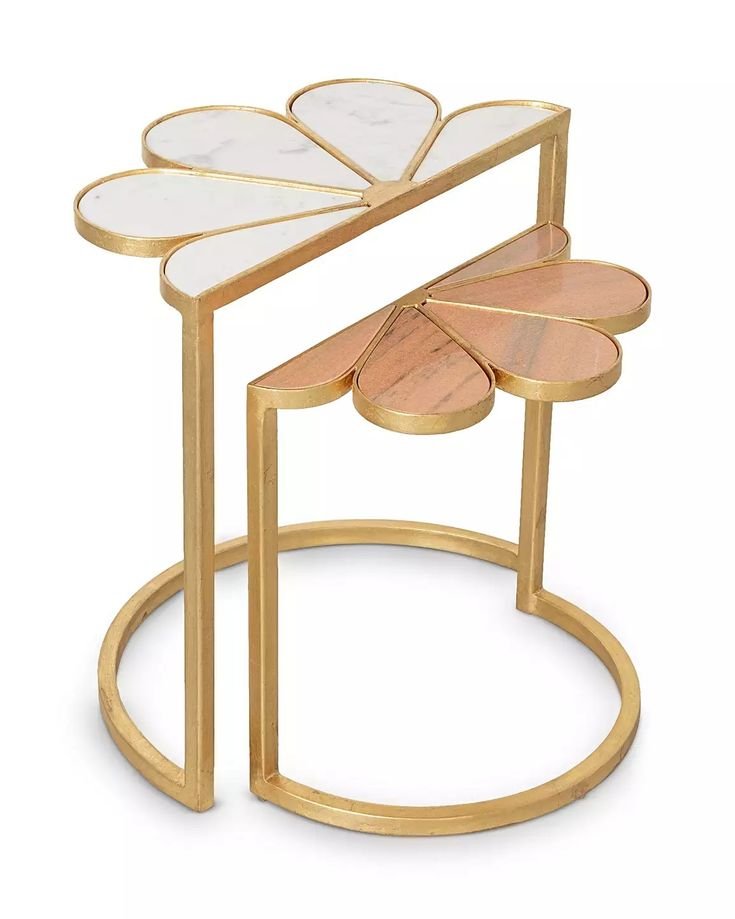 Add a statement of elegance to your interiors with this uniquely designed nested side table set. Featuring petal-shaped marble tops in contrasting tones, this piece blends artistic charm with modern luxury. The sleek gold-finished metal frame and circular base provide durability and style, while the nested design offers space-saving functionality. Perfect for contemporary living rooms, lounges, or upscale décor settings.