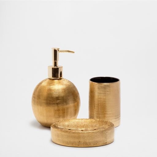 Elegant 3-piece bathroom set featuring a premium hammered gold finish. Includes soap dispenser, tumbler, and storage box—perfect for adding a modern, stylish, and luxurious touch to your bathroom décor.