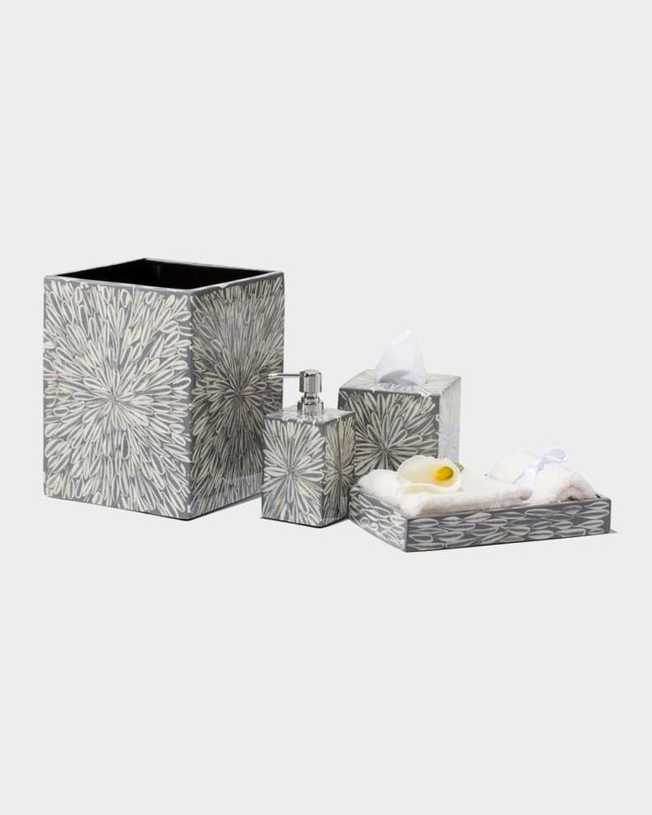 Elegant bathroom set featuring a stylish floral embossed design in a neutral finish. Includes soap dispenser, tissue box, tray, and waste bin—perfect for adding a fresh, decorative, and sophisticated touch to your bathroom space.