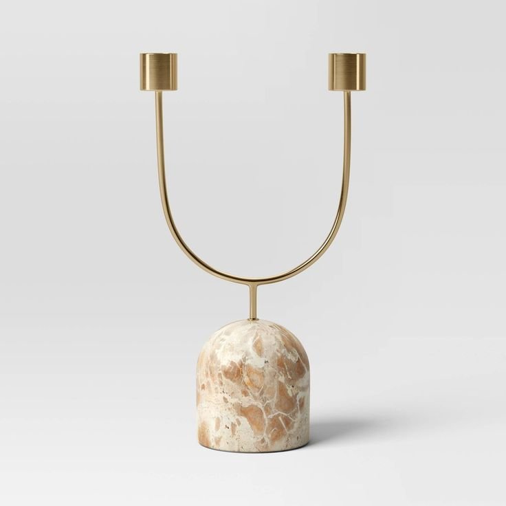 Elegant dual candle holder featuring a sleek gold U-shaped frame paired with a natural marble base. Perfect for taper candles, adding a minimalist and luxurious touch to modern home décor.