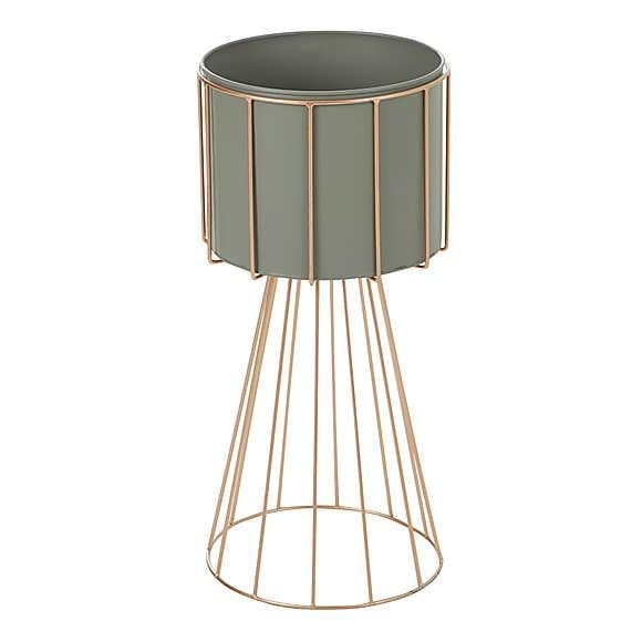 A sleek grey planter elevated on a delicate gold wire stand, combining minimalist design with elegant metallic accents to enhance any modern living space.