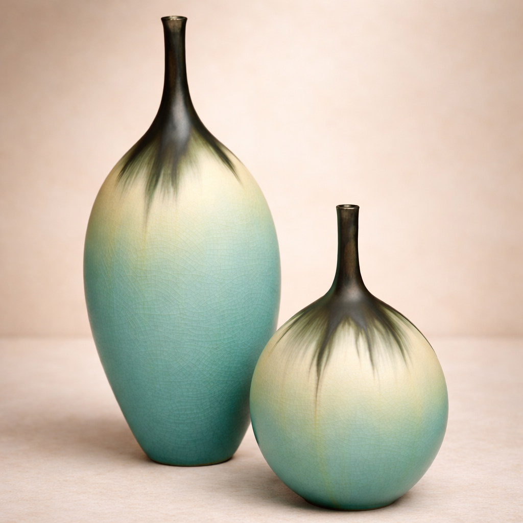 Premium Gradient Glaze Ceramic Vase Set (2-Piece) – Teal & Ivory Finish