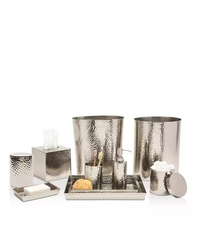 Elegant bathroom set featuring a textured hammered silver finish. Includes soap dispenser, toothbrush holder, tissue box, tray, soap dish, storage jar, and waste bin—perfect for a modern, luxurious, and coordinated bathroom look.