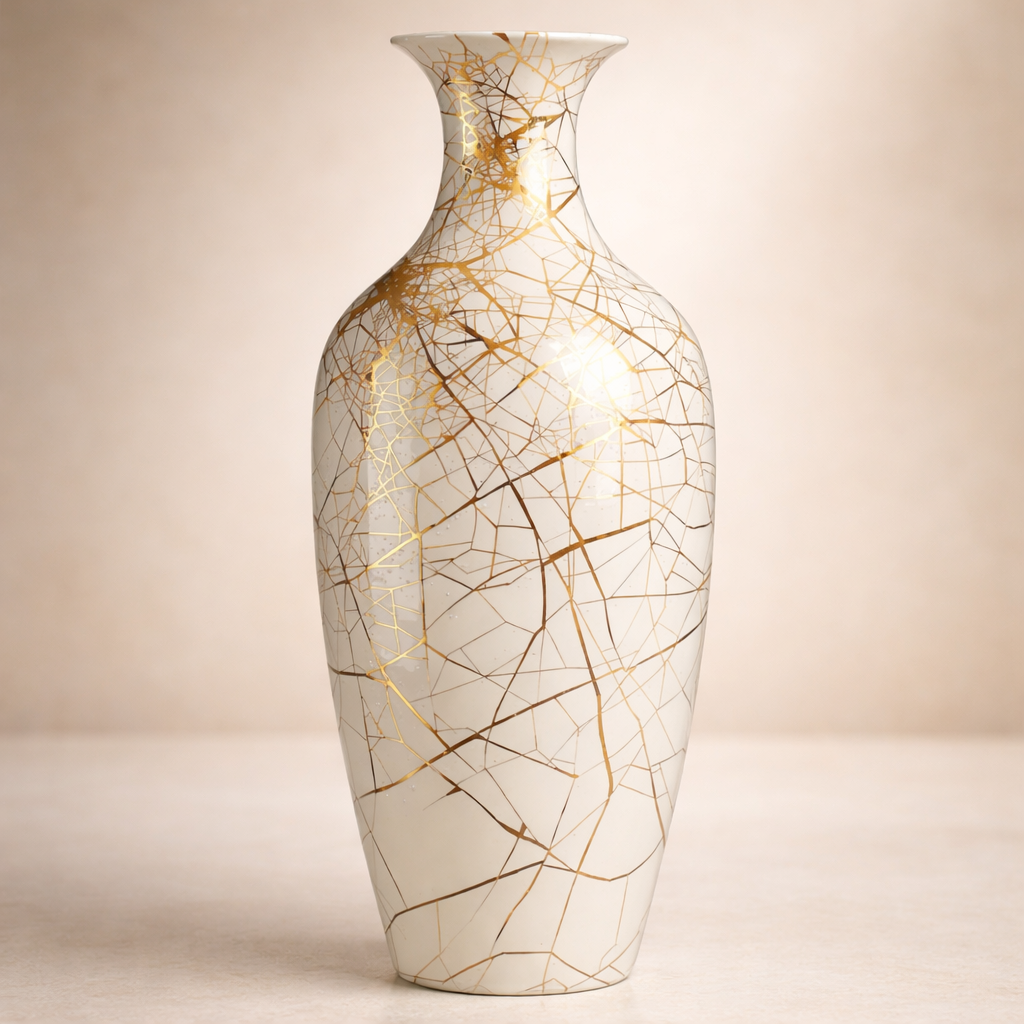 This luxurious ceramic vase features a glossy white finish enhanced with intricate gold crackle detailing inspired by the art of Kintsugi. Its tall, elegant silhouette with a flared neck creates a refined and timeless appeal. Perfect as a standalone statement piece or for floral arrangements, it adds sophistication and artistic charm to modern, classic, and luxury interiors.