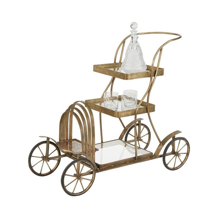 Unique cycle-inspired bar trolley crafted in an antique gold finish, featuring wooden serving trays and decorative wheels. Combines artistic design with functionality, perfect for serving drinks or adding a standout vintage accent to interiors.